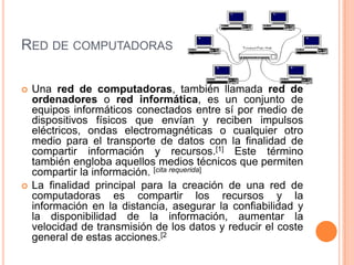 Este documento describe los conceptos básicos de Internet, incluyendo las definiciones de redes de computadoras, redes de área local, redes de área amplia, topologías de redes, tipos de arquitecturas de redes, elementos necesarios para conectarse a Internet como ordenadores, módems y proveedores de Internet, así como conceptos clave como direcciones IP, protocolos TCP/IP, dominios, servicios de Internet como correo electrónico y la World Wide Web, y URLs.