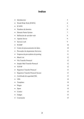 Este documento presenta información sobre conceptos relacionados con el diseño y programación web como el World Wide Web, ICANN, nombres de dominio, servidores web, protocolos como FTP, SMTP, TCP/IP, y elementos como URLs, templates y plugins. El autor también discute brevemente sobre proveedores de hosting, centros de procesamiento de datos y empresas de proveedores de correo no deseado.