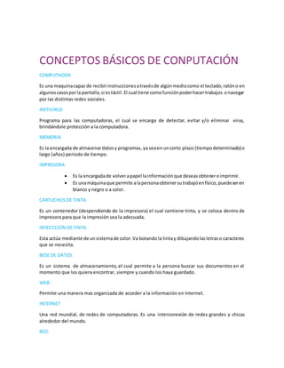 Este documento define conceptos básicos de computación como computadora, antivirus, memoria, impresora, cartuchos de tinta, inyección de tinta, base de datos, internet, red, red social, buscador, CPU, Excel, disco duro, hacker, hojas de cálculo, laptop, memoria RAM, modem, pantalla, Power Point, respaldos, USB, webcam, WiFi, Word, software, multimedia y virus. Explica brevemente el propósito y funcionamiento de cada uno de estos elementos tecnológicos fundamentales.