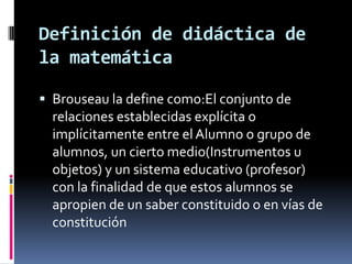La didáctica de la matemática se define como el conjunto de relaciones entre el alumno, los materiales didácticos y el profesor con el objetivo de que los alumnos aprendan conceptos matemáticos. Tradicionalmente se enfocaba en la aritmética y geometría básicas mediante cálculos y memorización, mientras que los enfoques activos promueven el aprendizaje a través del juego y la orientación del profesor. La didáctica estudia las situaciones didácticas e indidácticas, donde la