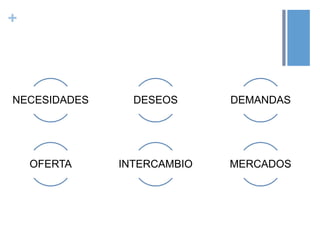 Este documento presenta conceptos básicos de la mercadotecnia, incluyendo necesidades, deseos, demandas, oferta, intercambio y mercados. Explica que las necesidades son estados de carencia percibida y pueden ser innatas o adquiridas. Los deseos se ven influenciados por la cultura y personalidad individual y se transforman en demandas cuando están respaldados por el poder adquisitivo. La oferta de mercadotecnia combina productos y servicios para satisfacer necesidades. El intercambio implica que la marca ofrece valor al cliente