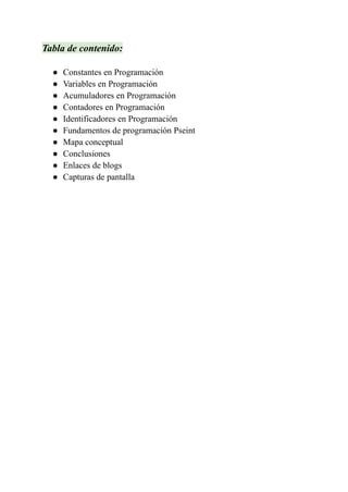 El documento aborda conceptos fundamentales de programación, como constantes, variables, acumuladores, contadores e identificadores, destacando su importancia en la estructuración del código y la eficiencia de los programas. También presenta la herramienta educativa Pseint, que facilita el aprendizaje de algoritmos mediante pseudocódigo y ofrece diversas funcionalidades. En conclusión, estos elementos son esenciales para el desarrollo y mantenimiento de software bien estructurado.