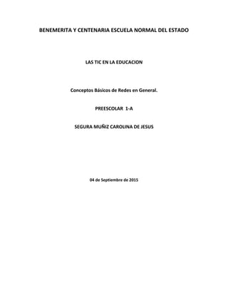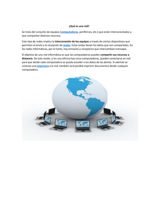 Este documento describe los conceptos básicos de las redes informáticas, incluyendo las definiciones de red, tipos de redes como PAN, LAN, WAN y MAN, topologías como bus, estrella y anillo, y elementos clave como servidores, estaciones de trabajo, tarjetas de interfaz, cableado y sistemas operativos. Explica que las redes permiten que las computadoras compartan recursos de forma remota y concluye enfatizando la importancia de las redes en el funcionamiento de las computadoras y en diversas áreas de la vida