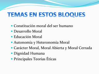 El documento aborda la constitución moral del ser humano y su desarrollo a través de la educación moral, discutiendo conceptos como autonomía y heteronomía moral, y la importancia de un aprendizaje ético a lo largo de la vida. Destaca la relevancia de la socialización en la adquisición de valores morales y diferencia entre la moral abierta y cerrada, enfatizando el deber de los educadores en fomentar la autonomía moral en los alumnos. Finalmente, se menciona la dignidad humana como un valor inalienable y se presentan diversas teorías éticas que buscan esclarecer el sentido de lo moral.