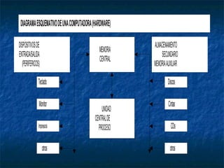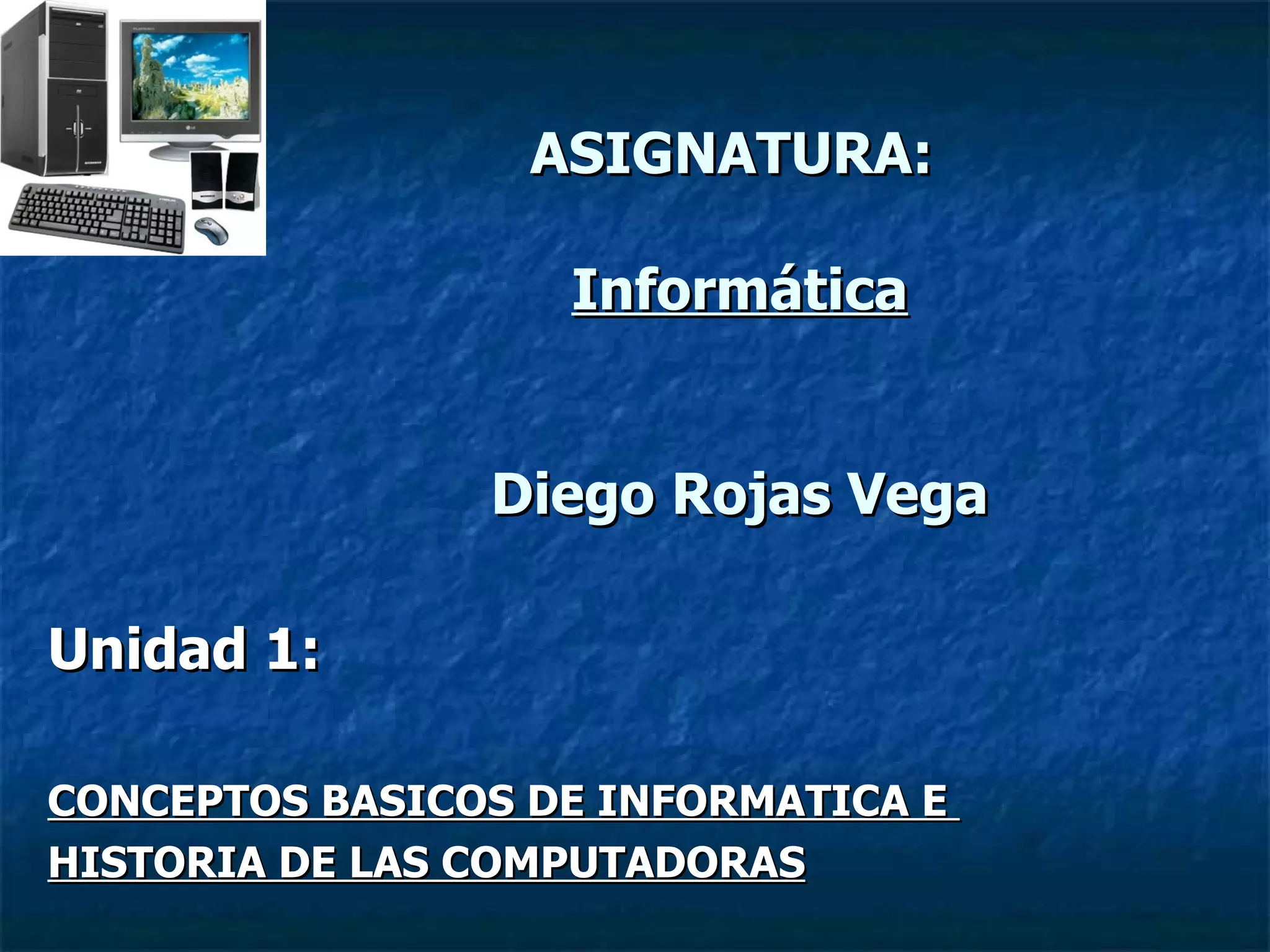 La computadora es una máquina electrónica capaz de procesar información rápidamente siguiendo instrucciones. La informática estudia el tratamiento automático de la información usando computadoras como herramienta principal. El bit, byte y caracter son unidades para medir información. El sistema operativo administra los recursos del sistema como programas, archivos y periféricos. Las computadoras han evolucionado de usar válvulas a transistores a circuitos integrados en cinco generaciones.