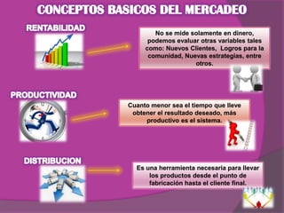 El documento habla sobre diferentes conceptos relacionados con el mercadeo y la administración de negocios. Explica que el éxito de una empresa no se mide solo en términos monetarios, sino también por factores como nuevos clientes y logros comunitarios. Además, define conceptos clave como el portafolio de productos, el proceso de ventas, el punto de equilibrio y el margen de contribución. Finalmente, resalta que el mercadeo debe enfocarse en ayudar a los clientes sin buscar solo el interés propio de la