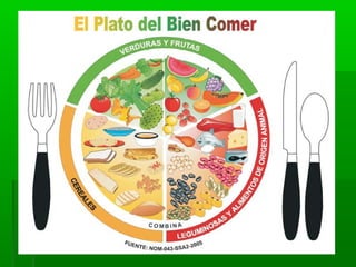 El documento detalla los conceptos básicos de nutrición, explicando la importancia de los alimentos y nutrimentos en el organismo, así como los tipos de macronutrientes y micronutrientes necesarios para una dieta equilibrada. También se describe el 'Plato del Bien Comer', que promueve la inclusión de verduras, frutas, cereales y leguminosas en la dieta diaria, junto con consejos para facilitar una alimentación saludable. Además, se destaca la importancia de la actividad física y la correcta selección de alimentos para el mantenimiento de la salud.