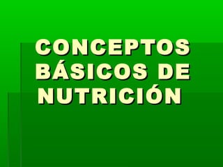 Este documento resume los conceptos básicos de nutrición. Explica que los alimentos son vehículos para obtener nutrimentos que permiten el funcionamiento del cuerpo, y que la alimentación implica seleccionar, preparar y consumir alimentos de manera adecuada, accesible, variada, suficiente e inocua. Describe los macronutrientes, micronutrientes, y la importancia de una dieta equilibrada y actividad física para la salud.
