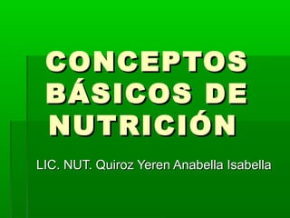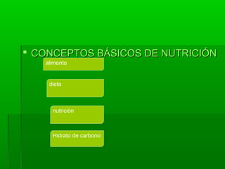 Este documento presenta conceptos básicos de nutrición, incluyendo definiciones de alimentos, dieta, nutrición y nutrimentos. Explica los macronutrimentos como hidratos de carbono, proteínas y lípidos, así como vitaminas y minerales. Describe el Plato del Bien Comer y la importancia de una dieta balanceada y actividad física para la salud.