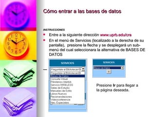 Este documento ofrece instrucciones para acceder a bases de datos en línea y realizar búsquedas efectivas. Explica cómo ingresar a la página principal de bases de datos y seleccionar la base de datos deseada. Luego describe dos tipos de búsqueda - básica usando lenguaje natural y avanzada usando operadores lógicos como AND, OR y NOT para combinar términos. Finalmente, presenta símbolos usados para indicar el tipo de documentos disponibles, como textos completos o resúmenes.