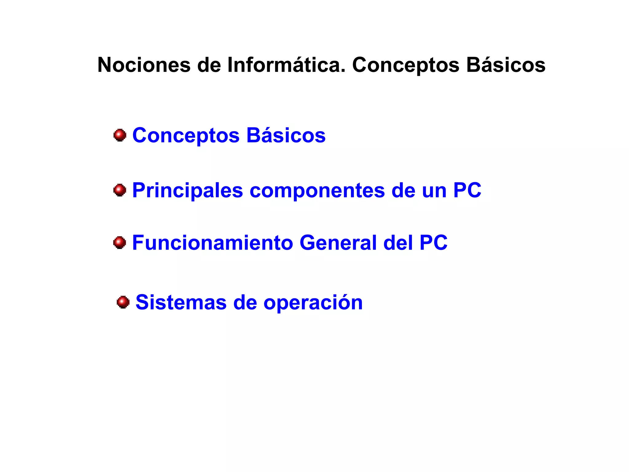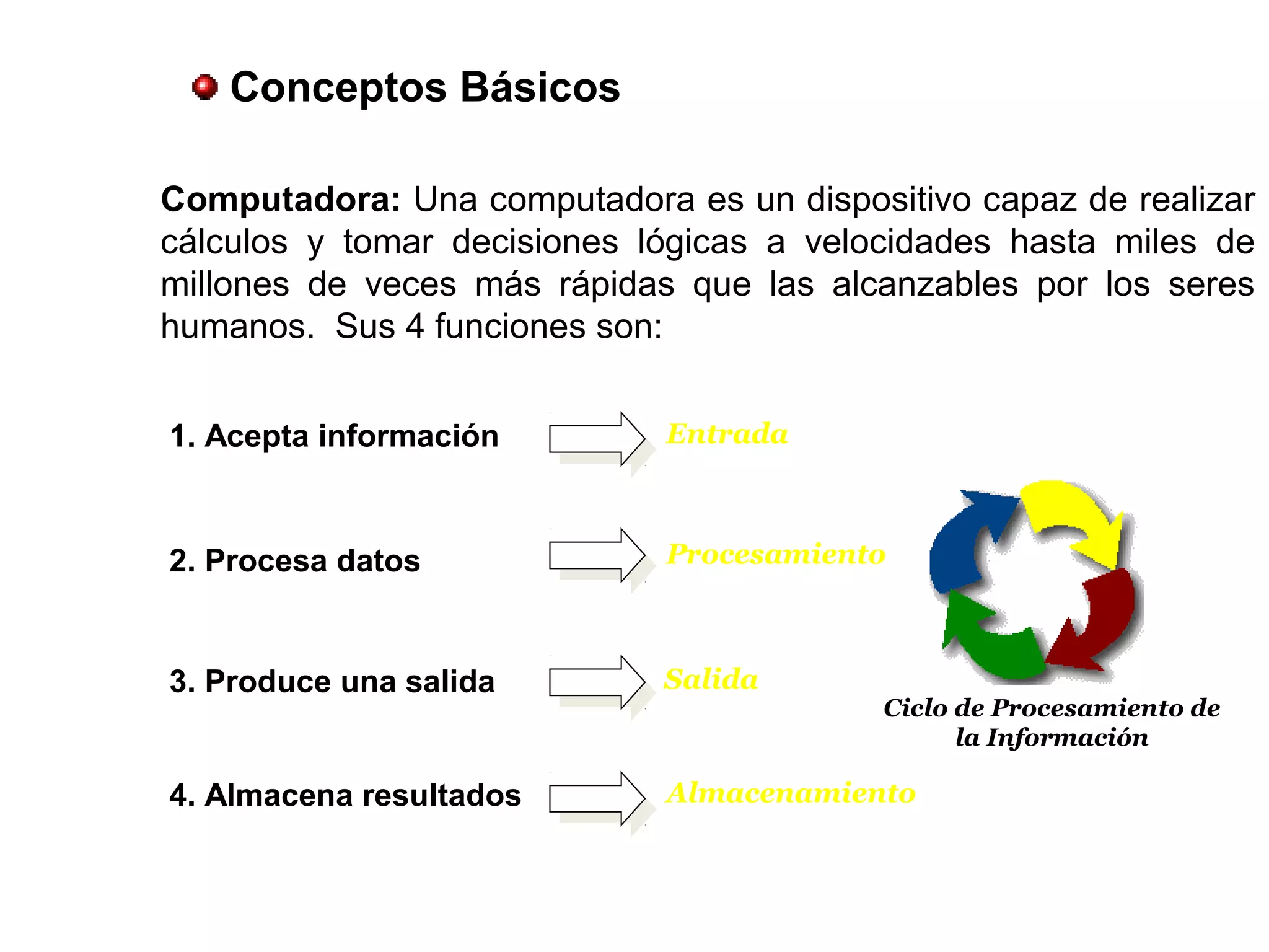 Este documento presenta conceptos básicos sobre computadoras e informática. Explica que una computadora puede realizar cálculos y tomar decisiones rápidamente, y define sus cuatro funciones principales: entrada, procesamiento, salida y almacenamiento. También describe los componentes principales de un PC, incluyendo la unidad central de procesamiento, memoria, tarjeta madre, unidades de entrada/salida y almacenamiento. Por último, brinda una explicación general sobre cómo funciona un PC al encenderse y cargar el sistema operativo.