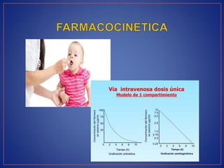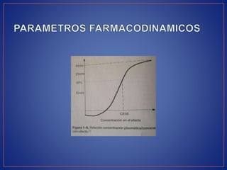 Este documento resume conceptos clave de farmacocinética y farmacodinámica. La farmacocinética se refiere al estudio de la absorción, distribución, metabolismo y excreción de fármacos en el cuerpo. La farmacodinámica estudia cómo los fármacos producen efectos en el organismo y cómo factores como la dosis, concentración plasmática y tiempo afectan la respuesta farmacológica. También explica conceptos como semivida, depuración, volumen de distribución y cómo estos determin