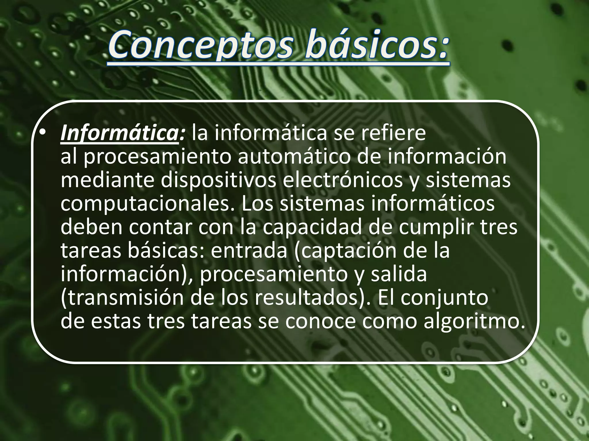 El documento describe los conceptos básicos de la informática, incluyendo hardware, software, sistemas operativos y periféricos. Explica que la informática involucra la captura, procesamiento y salida de información a través de dispositivos electrónicos y sistemas computacionales. También enumera varios ejemplos comunes de sistemas informáticos y describe las funciones clave del hardware, software y sistemas operativos.