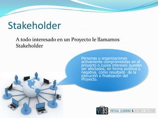 El documento describe los stakeholders de un proyecto, que son personas u organizaciones comprometidas o afectadas por el proyecto. Explica que es importante identificar a todos los stakeholders para determinar sus requisitos y expectativas, y comunicarse con ellos para administrar sus influencias en el proyecto.