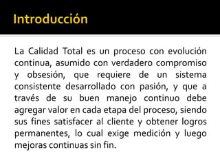 Este documento presenta los conceptos básicos sobre el control total de calidad. Explica que el control total de calidad busca adaptar permanentemente los productos y servicios a las necesidades de los clientes mediante el control de todas las actividades de la empresa. También describe los 14 principios de Deming para el control total de calidad, como la constante mejora de productos y servicios, la adopción de una nueva filosofía de calidad, y la eliminación del miedo en el lugar de trabajo. Además, identifica 7 enfermedades mortales de la gerencia que