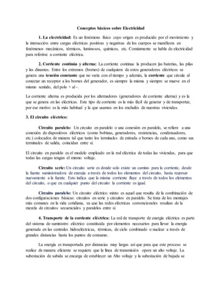 Este documento presenta conceptos básicos sobre electricidad, incluyendo las diferencias entre corriente continua y alterna, los tipos de circuitos eléctricos (serie, paralelo y mixto), y cómo se transporta la electricidad a largas distancias a través de líneas de transmisión y subestaciones. También explica términos como tensión, corriente, resistencia y potencia, y dispositivos mecánicos comunes como poleas, piñones y motores eléctricos. Finalmente, resume las leyes de Ohm y W