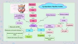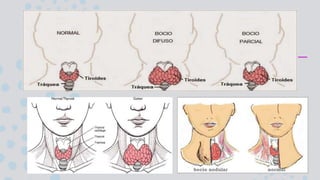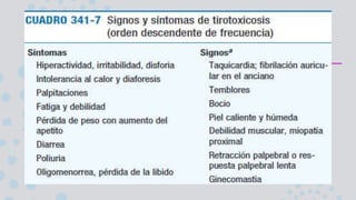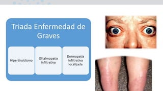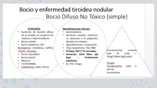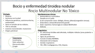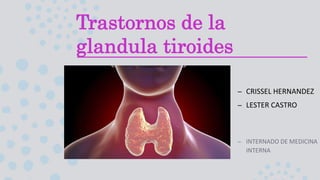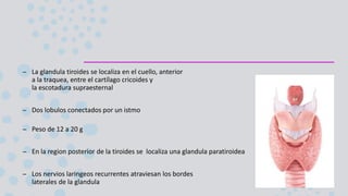 Este documento resume los trastornos de la glándula tiroides, incluyendo hipotiroidismo y hipertiroidismo. Describe la anatomía y función de la tiroides, así como las causas, manifestaciones clínicas, estudios de laboratorio, diagnóstico y tratamiento de ambas condiciones. El hipotiroidismo puede ser congénito, autoinmune o secundario, mientras que la causa más común de hipertiroidismo es la enfermedad de Graves mediada por anticuerpos.