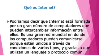 Internet está formada por una red mundial de computadores interconectados que pueden intercambiar información. Proporciona cuatro servicios principales: correo electrónico, grupos de noticias, acceso remoto a otros computadores, y transferencia de archivos. Los sitios web alojan páginas de información en servidores y pueden enlazarse entre sí, mientras que un dominio es la dirección para acceder a una página web en particular.