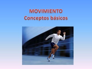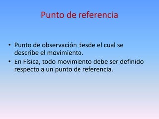 Este documento describe conceptos básicos de movimiento en física como punto de referencia, trayectoria, distancia y desplazamiento. Define que el punto de referencia es desde donde se describe el movimiento, la trayectoria es la ruta de un objeto en movimiento, y que la distancia es la longitud de la trayectoria mientras que el desplazamiento es la diferencia entre la posición inicial y final.