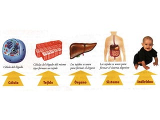 La biología es la ciencia que estudia la estructura y procesos vitales de los seres vivos, organizada desde el nivel celular hasta la biosfera. Incluye diversos sistemas y aparatos como digestivo, circulatorio y nervioso, que cumplen funciones específicas en el organismo. El documento también menciona organismos unicelulares y diversos componentes esenciales como proteínas y moléculas.