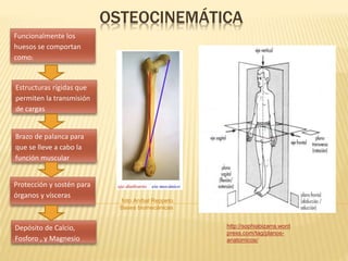 Este documento describe conceptos básicos de biomecánica ósea y articular. Explica que los huesos funcionan como estructuras rígidas que permiten la transmisión de cargas y como palancas para la función muscular, además de proteger órganos. Describe los diferentes tipos de articulaciones según su estructura y función, así como los componentes de las articulaciones sinoviales como el cartílago, líquido sinovial y membrana sinovial. Finalmente, explica conceptos de movimiento articular como la rotación, desliz