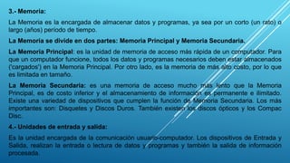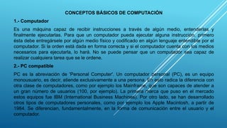 El documento describe los conceptos básicos de computación, incluyendo las definiciones de computador, memoria, hardware, software, datos e instrucciones. Explica los diferentes tipos de computadores personales, memorias, unidades de entrada y salida, e impresoras. También define términos clave como bit, byte, palabra y lenguajes de programación.
