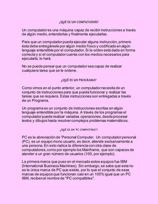 Este documento define los conceptos básicos de computación como computador, programa, hardware y software. Explica que un computador es una máquina capaz de recibir y ejecutar instrucciones codificadas. Los programas son conjuntos de instrucciones que permiten a los computadores realizar tareas específicas. El hardware se refiere a las partes físicas como la CPU, memoria y periféricos, mientras que el software incluye sistemas operativos y aplicaciones. También describe varios componentes de hardware como monitores, teclados e impres