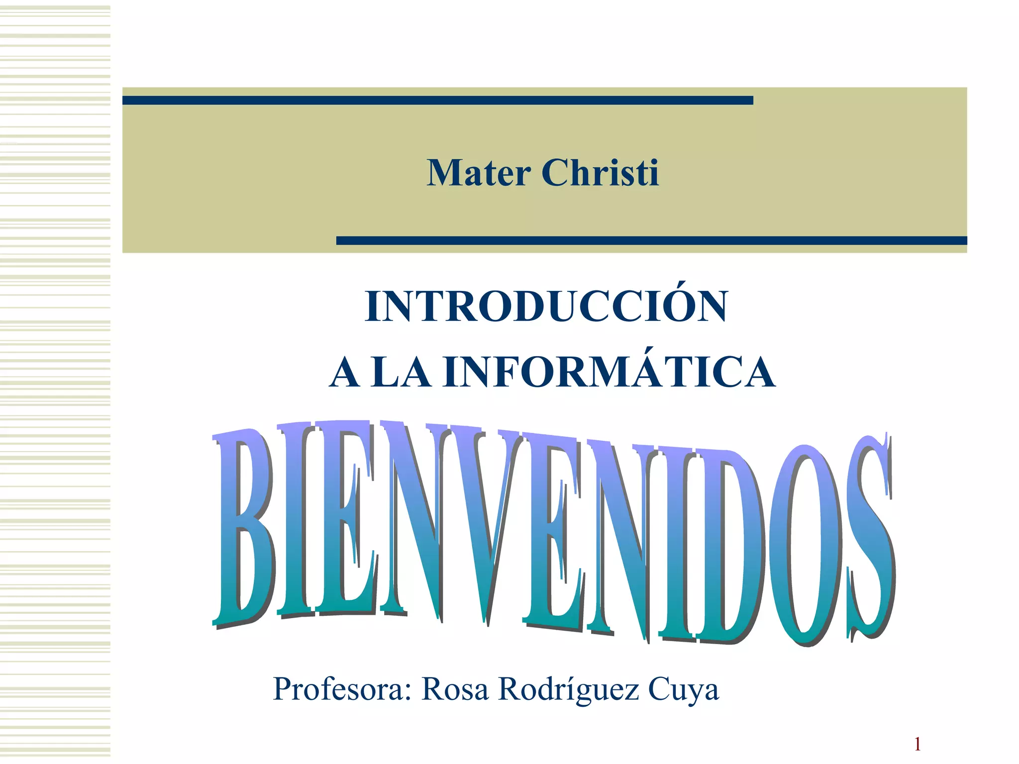 Este documento presenta una introducción básica a la informática. Explica que la informática es la ciencia del tratamiento de la información por medio de computadoras. Define las partes principales de una computadora, incluyendo el teclado, monitor, unidades de disco, impresora y la unidad central de procesamiento. También menciona algunos periféricos adicionales como mouse, scanner y modem. El objetivo del curso es capacitar a los estudiantes en el uso de programas de productividad para facilitar sus tareas educativas.