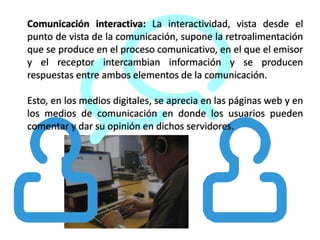 El documento habla sobre los diferentes tipos de comunicación digital como la comunicación a través de símbolos lingüísticos u otros medios como audio, video e imágenes. También describe la comunicación interactiva y cómo ha evolucionado la web de solo contener información de forma unidireccional (Web 1.0) a permitir la retroalimentación y participación de usuarios (Web 2.0). Finalmente, presenta una visión de la Web 3.0 como una web inteligente basada en la nube.