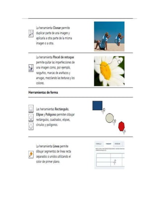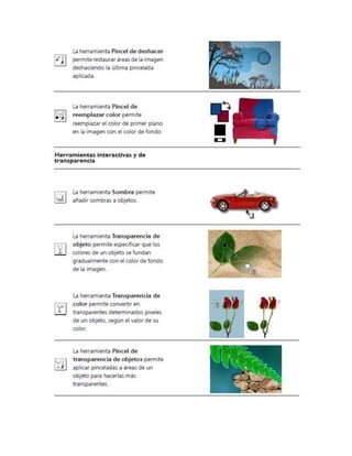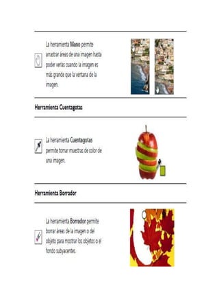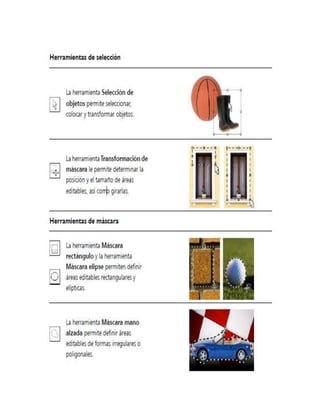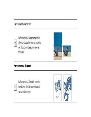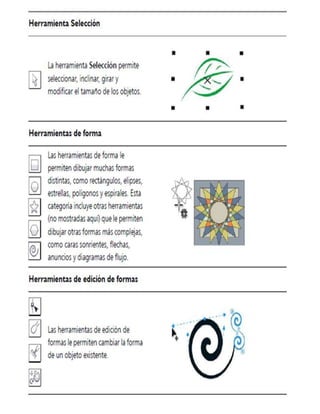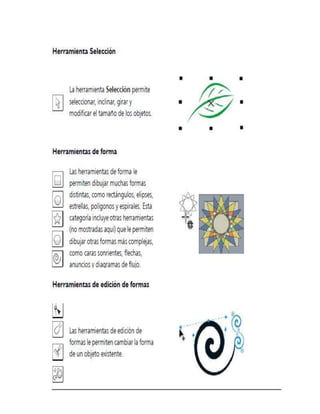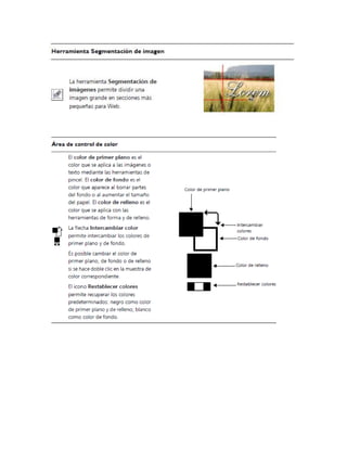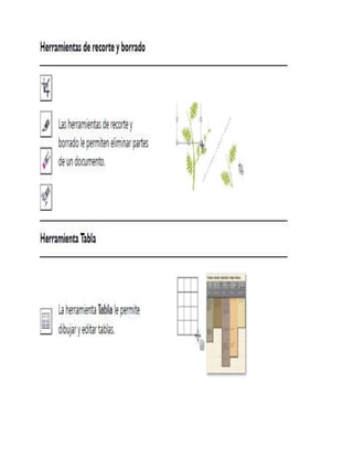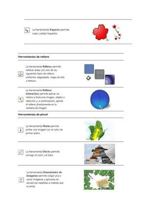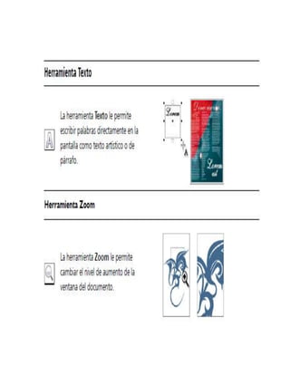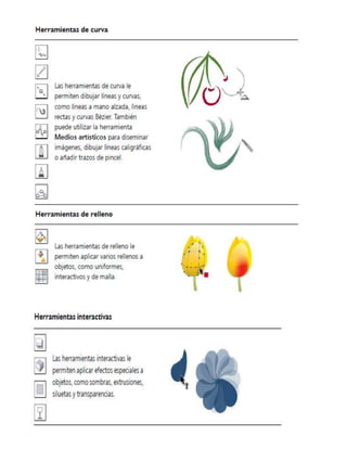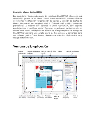 Este documento proporciona una introducción al espacio de trabajo de CorelDRAW X5. Describe los principales componentes de la interfaz como la caja de herramientas, la barra de menús, la ventana del documento y las barras de herramientas. Explica cómo la caja de herramientas contiene herramientas para crear y modificar objetos, y cómo las ventanas acoplables brindan acceso a comandos y opciones relacionados con las herramientas. El documento también enumera las categorías principales de herramientas disponibles en