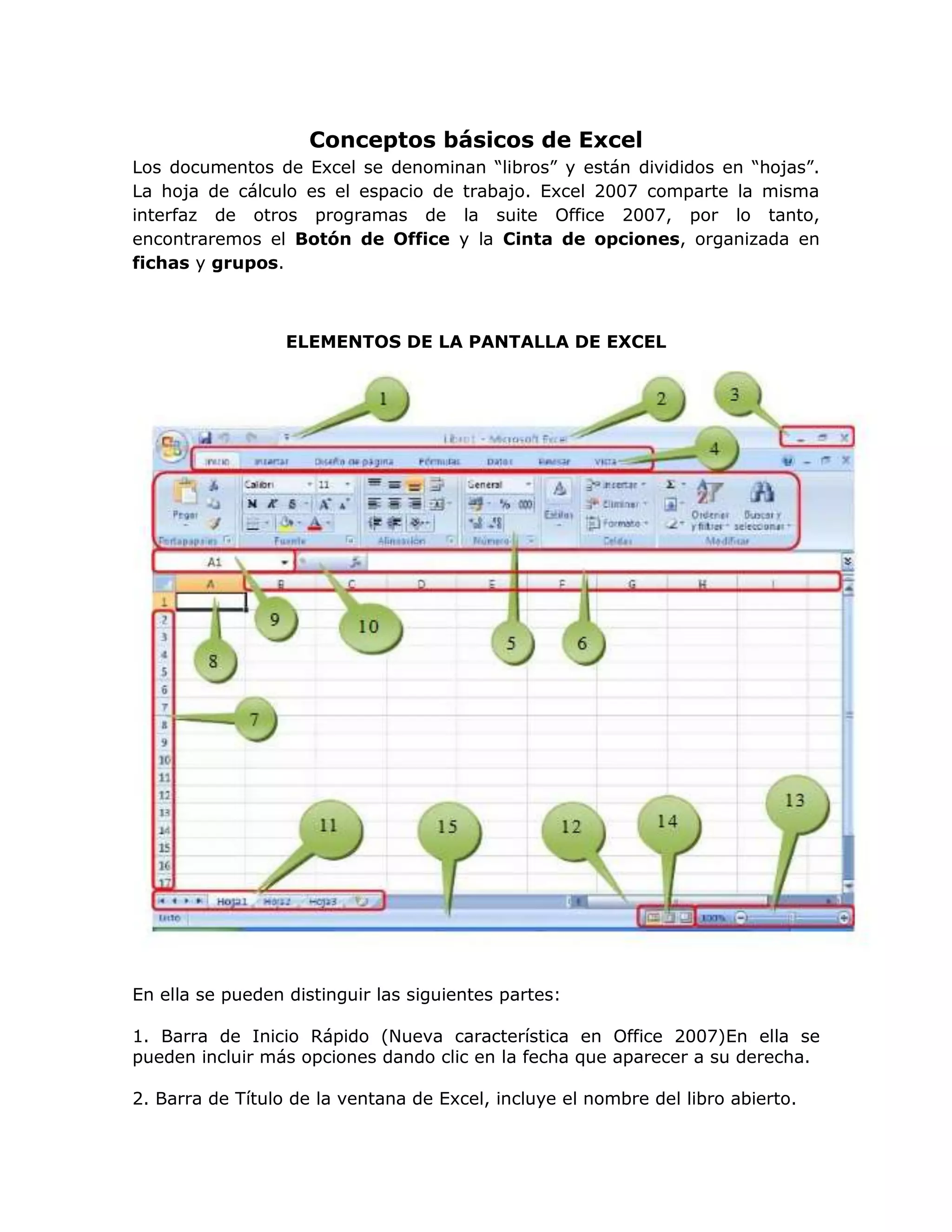 El documento describe los conceptos básicos de Excel. Excel usa "libros" que contienen "hojas" donde se realiza el trabajo. La interfaz de Excel 2007 es similar a otros programas de Office 2007 y cuenta con pestañas y grupos de opciones. Las hojas de cálculo contienen filas, columnas y celdas que permiten ingresar y almacenar datos.