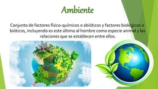 El documento define los principales términos relacionados con la ecología: Ambiente, Ecología, Ecosistema y Biodiversidad. La Ecología es la ciencia que estudia las relaciones entre los organismos y su ambiente. Un Ecosistema es el conjunto de comunidades biológicas que interactúan en un hábitat compartido. La Biodiversidad se refiere a la amplia variedad de seres vivos en la Tierra, resultado de millones de años de evolución y afectada por las actividades humanas.