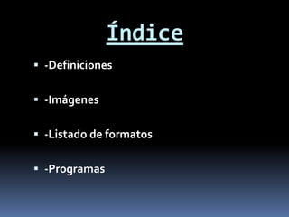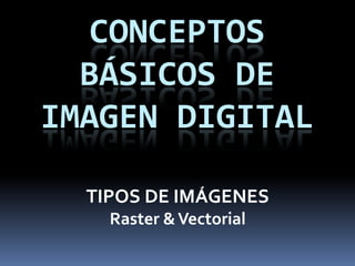Este documento describe los conceptos básicos de las imágenes digitales, incluyendo los tipos de imágenes raster y vectoriales. Las imágenes raster se componen de una matriz de píxeles con una profundidad de color determinada, mientras que las imágenes vectoriales se componen de objetos geométricos definidos matemáticamente. También lista formatos comunes de archivos de imágenes y programas de edición para cada tipo.
