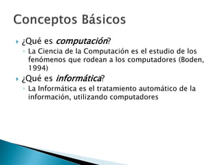 Este documento describe los conceptos básicos de computación e informática. En primer lugar, define la computación como el estudio de los fenómenos relacionados con los computadores, e informática como el tratamiento automático de la información utilizando computadores. Luego, explica que un computador es un dispositivo electrónico capaz de procesar información a partir de instrucciones programadas, y que puede realizar diversas tareas mediante diferentes programas. Finalmente, destaca algunas razones por las cuales es útil estudiar informática, como el impacto de los computadores y el