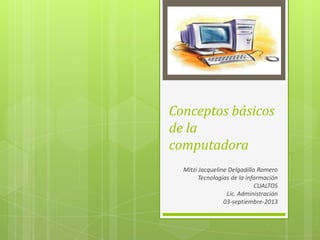 El documento describe los conceptos básicos de la computadora, incluyendo su origen, hardware, software y periféricos. Explica que el hardware incluye el procesador, memoria, almacenamiento y otros dispositivos, mientras que el software incluye sistemas operativos y aplicaciones. También cubre medidas para trabajar de forma segura y saludable con computadoras.
