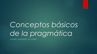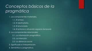 Este documento presenta los conceptos básicos de la pragmática. Explica los componentes materiales de la comunicación como el emisor, destinatario, enunciado y entorno. También describe los componentes relacionales como la información pragmática, intención y distancia social. Finalmente, distingue entre el significado semántico y la interpretación pragmática de un enunciado.