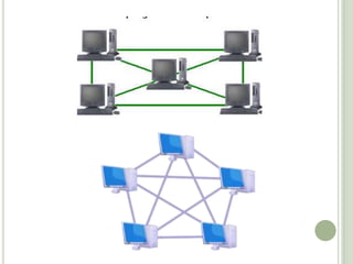 El documento describe diferentes tipos de redes, incluyendo redes públicas, privadas, LAN, MAN, WAN, así como diferentes topologías de red como anillo, árbol, estrella, malla y bus. También explica conceptos como Internet, intranet, extranet, puente de red, switch, cable óptico y módem.