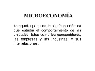 El documento presenta conceptos básicos de microeconomía, incluyendo la definición de microeconomía como el estudio del comportamiento de unidades como consumidores, empresas e industrias. Explica conceptos como la función de producción, producto total, medio y marginal, y la ley de rendimientos decrecientes.