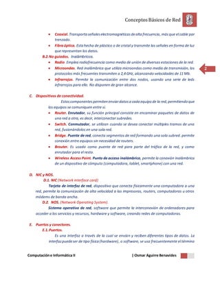 El documento describe los conceptos básicos de las redes, incluyendo los tipos de redes como LAN, WAN y MAN, los medios de transmisión como alámbricos e inalámbricos, y los dispositivos de conectividad como routers, switches y puntos de acceso inalámbricos. También explica conceptos como puertos, velocidades de transmisión, direcciones IP estáticas y dinámicas, y diferentes tipos de servidores como DHCP, DNS, web y de correo.