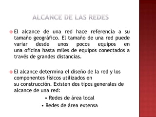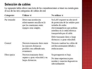 Este documento describe los conceptos básicos de las redes de área local (LAN) y redes de área extensa (WAN), incluyendo los tipos de cables, adaptadores de red y topologías comúnmente utilizados. Explica que las LAN conectan equipos cercanos, mientras que las WAN conectan equipos a grandes distancias, como entre países. También describe los componentes físicos clave como cables, adaptadores de red y dispositivos inalámbricos que permiten la comunicación entre equipos en una red.