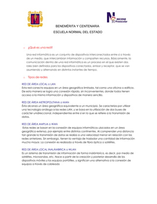 Una red informática es un conjunto de dispositivos interconectados que comparten información y recursos. Existen varios tipos de redes como las redes de área local (LAN), las redes de área amplia (WAN) y las redes inalámbricas (WLAN). Los elementos clave de una red incluyen servidores, estaciones de trabajo, tarjetas de interfaz, cableado y sistemas operativos.