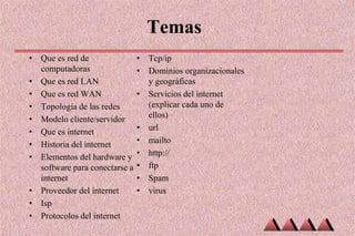 Este documento resume los conceptos básicos de las redes de internet. Explica qué son las redes LAN y WAN, la topología de redes, el modelo cliente-servidor e internet. También describe la historia de internet, los elementos hardware y software necesarios para conectarse, los proveedores de internet, los protocolos TCP/IP, los dominios organizacionales y geográficos, y los principales servicios de internet como correo electrónico, mensajería instantánea y transferencia de archivos. Por último, define términos clave como URL, mailto, HTTP,