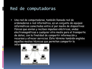 Este documento describe conceptos básicos de redes e Internet. Explica que una red de computadoras permite compartir información y recursos entre equipos conectados, y que existen diferentes tipos de redes como LAN, WAN e Internet. También define términos como topología, cliente-servidor, protocolos TCP/IP, servicios como el correo electrónico y la World Wide Web, e introduce conceptos de hardware y software necesarios para conectarse e interactuar en redes e Internet.