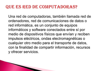 Una red de computadoras es un conjunto de equipos informáticos y software conectados entre sí para compartir información y recursos. Las redes pueden conectar computadoras a nivel local (LAN) o a gran escala (WAN) utilizando líneas telefónicas, ondas de radio o cableado. Los protocolos TCP/IP son fundamentales para la comunicación entre equipos en una red.