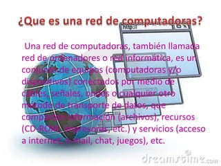 El documento describe las redes de computadoras, incluyendo las redes locales (LAN), las redes de área amplia (WAN) e Internet. Explica que una red conecta equipos como computadoras y dispositivos para compartir información, recursos y servicios. También describe los componentes clave de una red como topologías, protocolos, servidores y proveedores de servicios de Internet.