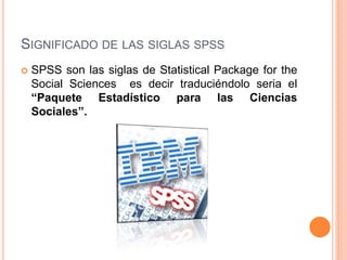 Este documento define SPSS y describe sus características y usos. SPSS es un paquete estadístico para análisis de datos cuantitativos y cualitativos. Permite introducir datos, realizar cálculos básicos, manipular bases de datos e implementar técnicas estadísticas. El documento también explica los tipos de variables nominales, ordinales e intervalos/razón.