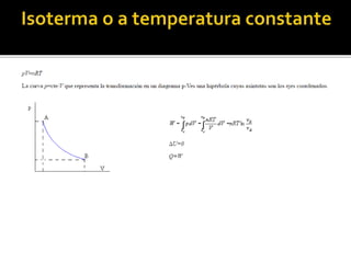 El documento aborda los conceptos básicos de la termodinámica, describiendo los estados de la materia (sólido, líquido y gas) y el estado de equilibrio de un sistema. Se explican las relaciones entre variables como presión, volumen y temperatura a través de la ecuación de estado de un gas ideal, así como la distinción entre calor y energía interna. Además, se discute la primera ley de la termodinámica y cómo se aplica a sistemas de muchas partículas, incluyendo transformaciones a volumen y presión constante.