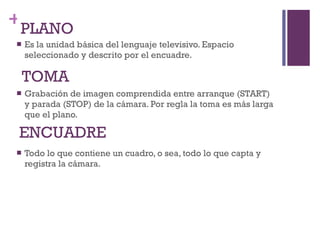 El documento presenta los conceptos básicos de los planos y ángulos de cámara utilizados en la televisión. Explica que un plano es la unidad básica y describe los diferentes tipos de planos según la distancia y posición de la cámara, como planos generales, medios, primeros planos y detalle. También define conceptos como encuadre, secuencia, campo y fuera de campo, profundidad de campo, ángulo de cámara frontal, de tres cuartos y picado, así como los diferentes tipos de movimiento