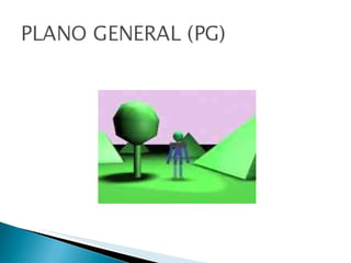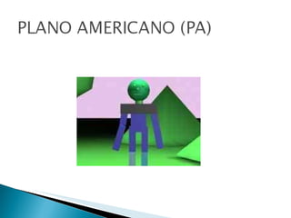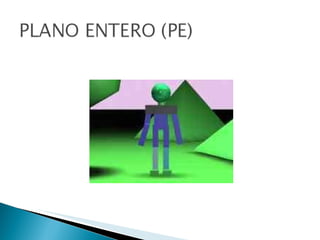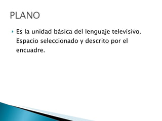 Este documento describe diferentes elementos básicos del lenguaje cinematográfico y televisivo. Define conceptos como toma, plano, plano-secuencia y encuadre. Explica los ángulos de cámara como frontal, tres cuartos y perfil. También describe diferentes tipos de movimientos de cámara como panorámica y travelling. Finalmente, introduce el concepto de eje de acción en una escena.