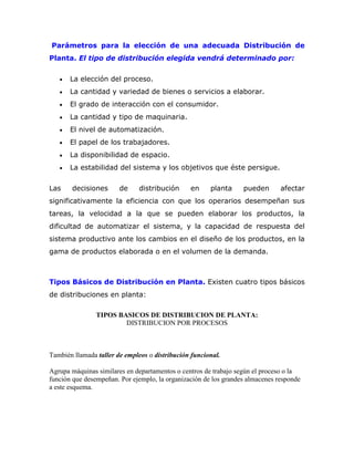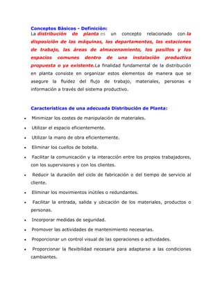 Este documento describe los conceptos básicos de la distribución de planta. Define la distribución de planta y sus objetivos de organizar los elementos de producción para asegurar el flujo eficiente de materiales, personas e información. Luego describe cuatro tipos básicos de distribución - por procesos, por producto, en punto fijo y distribuciones híbridas - y sus características y ventajas/desventajas. El documento proporciona una introducción general a los principios fundamentales de la distribución de planta.